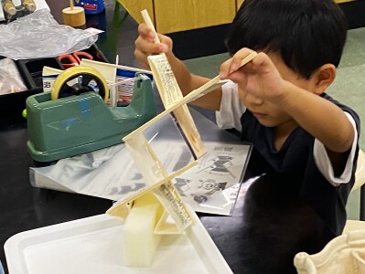 完成した後は、作ったマジックハンドで、楽しそうに伸び縮みさせたり、スポンジをつかんだりして、遊びました。