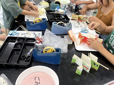 作り方は簡単。まず、1Lの紙パックを横に三等分して切りとってのような形にします。次に、それを3つつなげてのような形でセロハンテープをとめて、さらに端ので物をつかむ部分を作ります。最後に、わりばしで持ち手とパックの間に骨としてくっつけると完成です。