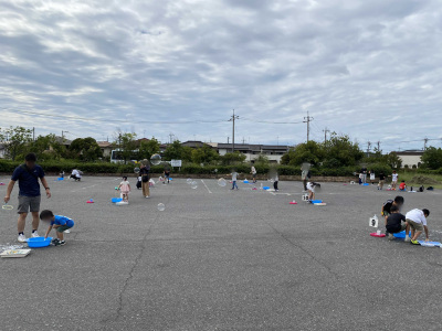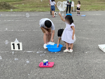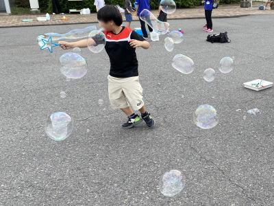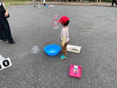 遊ぶ前に『 地面がシャボン液で滑りやすくなっているので絶対に走らないで 』という注意事項をお伝えして、あとは自由にシャボン玉の体験をしました✨ オーソドックスな丸い枠だけでなく、星型、ハート型、くまさんなどなど、どんな形の枠を使っても、生み出されるシャボン玉は、全てまんまるの球体です。 自然の造形美とも感じるふしぎな体験を楽しんでいました。 大きな穴の枠では、シャボン玉を上手につくることがまだまだ難しい小さいお子さんも、うちわをパタパタ振って、たくさんシャボン玉を作って楽しんでいました✨
