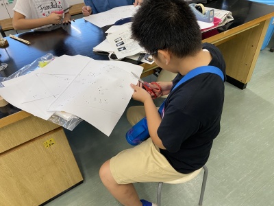 材料は、雨傘(黒い生地)、星空型紙、ホワイトマーカー、夜光塗料、竹の箸です。まずは、型紙を切る作業。型紙は星の地図を印刷し、傘の形に合わせて8等分したもの。三角形を8枚切っていきます。次に、型紙に星の穴をあけていきますがここで要注意!1等星の明るい星は大きな穴、2等星以下の暗い星は小さい穴にします。穴の大きさを変えることで、より本物に近い星空になります(^^)v