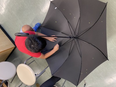 仕上げは講師の先生のところへ。何やらへんてこな形の大きな型紙を傘に被せて何をするのかと思いきや、その上からスプレーをシューっ‼ せっかく星をたくさんつけたのに!と思ったら、なんと夜光スプレー「天の川」を作っていたのでした( *´艸`) 強く吹いてしまうとはっきり見え過ぎてしまうので、慎重にそっと吹き付けるのがポイント。子どもたちは、うまいくかドキドキ真剣な顔…それにしても天の川もちゃんと再現!さすがです!