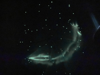 傘が完成したら外に出て、太陽光に10分ほど当てて乾かしながら光を溜めます。ちなみにLEDライトでは、夜光塗料は光らないそう。太陽光か蛍光灯に当ててしっかりと光を溜めます。どんなふうにみえるか、楽しみですね~!