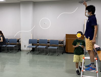 完成したら、高い所から離したり、長い棒で上にあげたりと「人間の知恵」で、がんばってタネ飛行機が長く宙に舞うように工夫しました。上手くいくと、何回もクルクル回ったり、すーっと一直線に遠くまで飛んだり、同じ紙なのにいろんな飛び方に変化するのが楽しめました。