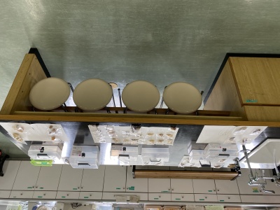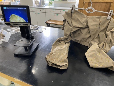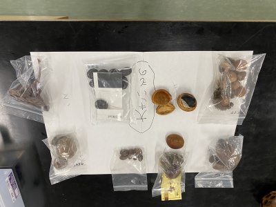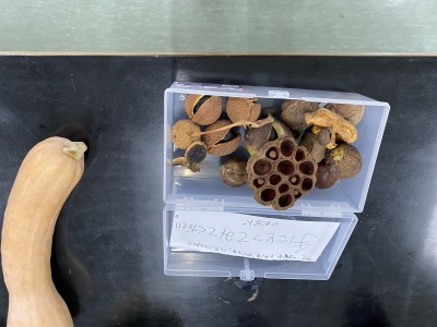 部屋を見渡すと、前半のお話や映像の中にもあった「動物に運ばれる」以外の方法で種を飛ばすいろいろな「植物の知恵」をもった種がたくさんありました。オナモミ・ヌスビトハギ・センダングサなど「ひっつきむし」とか呼ばれる服や髪についてくる種は、周りがカギのようになっていて、たくさんつくと全部取るのはなかなか大変ですよね。他にも、ホウセンカ・テッポウユリ・ゲンノショウコなど「種が弾ける」植物、タンポポ・ガガイモ・テイカカズラなど「種が風に浮く」植物、ヤシ・トチノキなど「水で運ばれる」植物もありました。