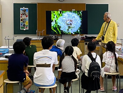 では、植物はどうやって種を遠くに広げて、住む場所を分けたり離したりするのでしょう。まず、前半はスライドや映像、子どもたちも楽しいクイズなどを通して植物博士に近づきました。