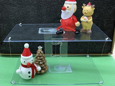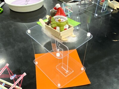 宙に浮いたように見えるひみつは「テンセグリティ構造」。テンセグリティ構造は「固い物同士が触れ合うことなく、柔らかい物でバランスをとって成り立つ立体」のことです。 少し触るとゆらゆらするけど、上手にバランスがとれるしっかりとした立体。インテリア雑貨屋店などで、木材を使った物を見たことがあるかしれませんね。今回は、サンタさんが宙に浮いたように見えるように、透明なアクリル板や透明な釣り糸で作りました。