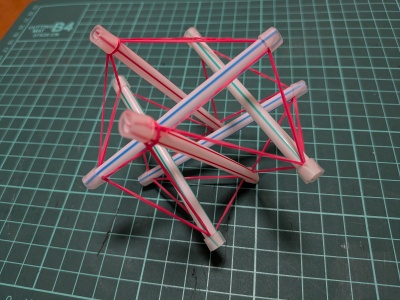 用意した材料をそれぞれアクリル用の接着剤や両面テープでくっつけて、2つのパーツを組み立てたら、お互いに糸を通してバランスがとれる位置に留め具を固定すれば、不思議なテンセグリティ構造の出来上がり。