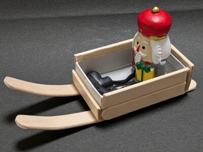 もう一つは、マッチ箱と木製スティックでサンタをのせるソリ作り🎅。完成したテンセグリティ構造本体にサンタ人形と一緒にソリ飾りをのせて完成!見本では雪のような白い綿やぴかぴか光る電飾など、いろいろ飾ってアレンジを紹介しました♪