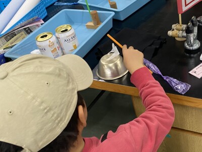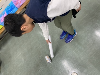 次の実験は『転がれアルミ缶』。布でこすった発砲スチロールの棒を近づけると、アルミ缶がコロコロ~と転がっていきました。アルミ缶はプラスに帯電しやすいので、棒に犬の散歩のように付いてきます。中には走りながらすごく速く転がす子も!あれ、どこまで行くのー?