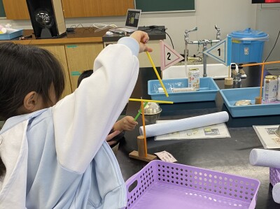 またまた、ストローを使った実験。今度はストローとストローの対決です!さあ引っ付くのか?離れるのか?布でこすって、近づけてみると… ついてきたー!!しかも勢いあまってぶつかりそう!うまく速さを調節したらぐるぐる回っていきました。触らずにストローが回る光景はなんとも不思議。まるでストロー杖で魔法をかけてるみたい!でもストローじゃなく自分の手を近づけると、スーッと離れていきました。今度はハンドパワー!?