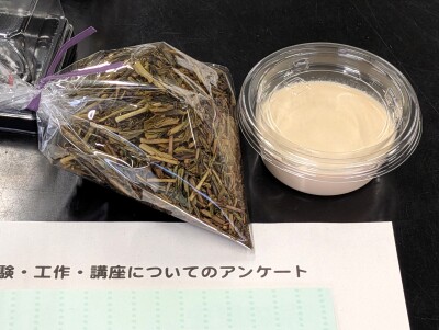 おまけに、先生手作りの「ほうじ茶パンナコッタ」の試食と実演がありました。茶葉は海苔などと同じ乾物なので、ちゃんと保存していても古くなってくると、どうしてもだんだんとその香りやおいしさが損なわれてきます。そこで、そんな茶葉をフライパンで軽く炒るだけで、香りが芳醇なできたて「ほうじ茶」に変身します。今日の講座でも、実験室中すてきな香りに包まれました(実はその廊下も)。
