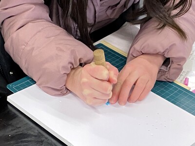次は、ちょっと難関。ストローに千枚通しで穴を開けます。大きい子は大丈夫ですが、小さい子はちょっと危ないということで、おうちの人に手伝ってもらって、各部品を作っていきます。あとは、手順に沿ってセロハンテープやつまようじで組み合わせると、かざぐるまの完成です!!
