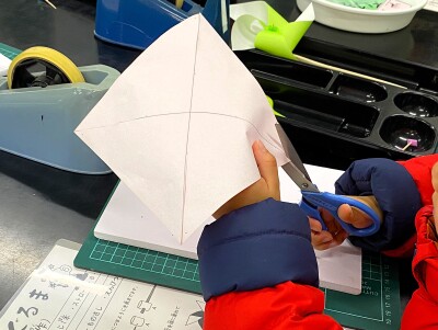 まず、折り紙をハサミで切ります。折り紙にはちゃんと印がしてあり、それに沿って切ると、かざぐるまの羽になります。小さい子どものハサミの練習にはぴったりでした。おうちの人とゆっくり丁寧に…チョキ、チョキ。