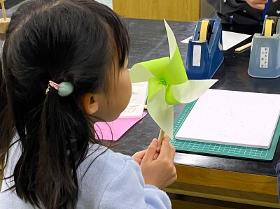 できあがった、かざぐるまで遊んでみましょう♪ ただの折り紙とわりばしですが、風をきちんとうけると本当によく回ります!! 子どもたちは始めは、息を吹きかけたり、手で仰いだりしていましたが、意外によく回ることが分かると、そのうち手に持って一直線に走りだしたり、その場でかざぐるまを持ったまま、横にぐるっと一回転したりして、羽が回るのを楽しんでいました。おうちの人も「きれい~」「よく回る~」好評でした。