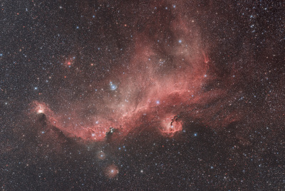わし星雲と呼ばれもしますが、いて座のM16も同じ名で重なってしまうので、最近は「かもめ星雲」の言い方が主流となっています。広がりを持った星雲で、肉眼では見えませんが、天体用カメラにはよく写ります。
