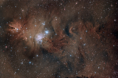 100個ほどの青い星団の周辺に細長い三角型の赤い星雲が広がっています。クリスマスツリーに星の飾りをちりばめたように見えるところから、クリスマスツリー星団と呼ばれています。