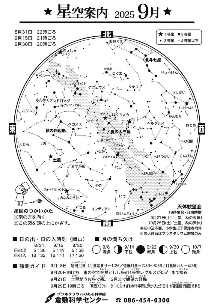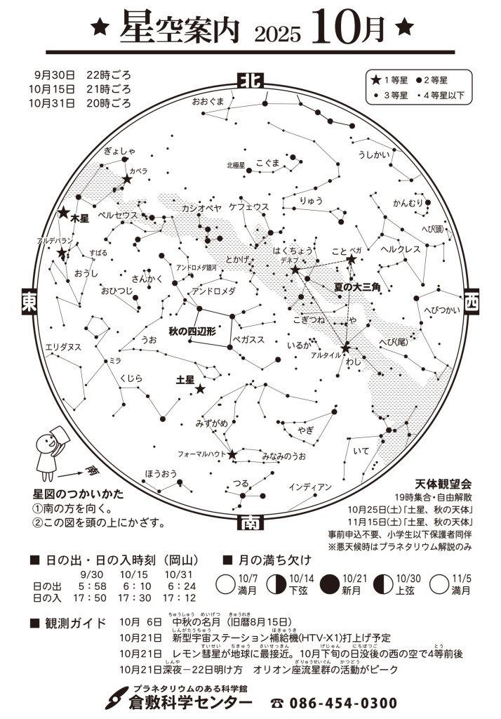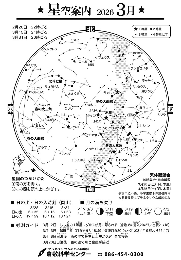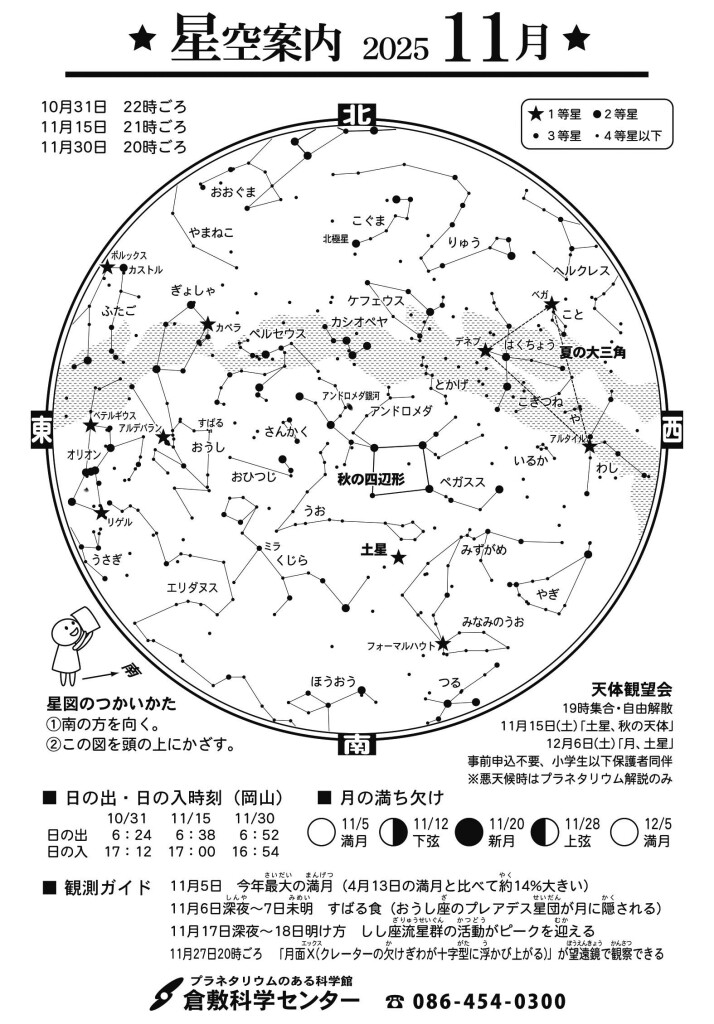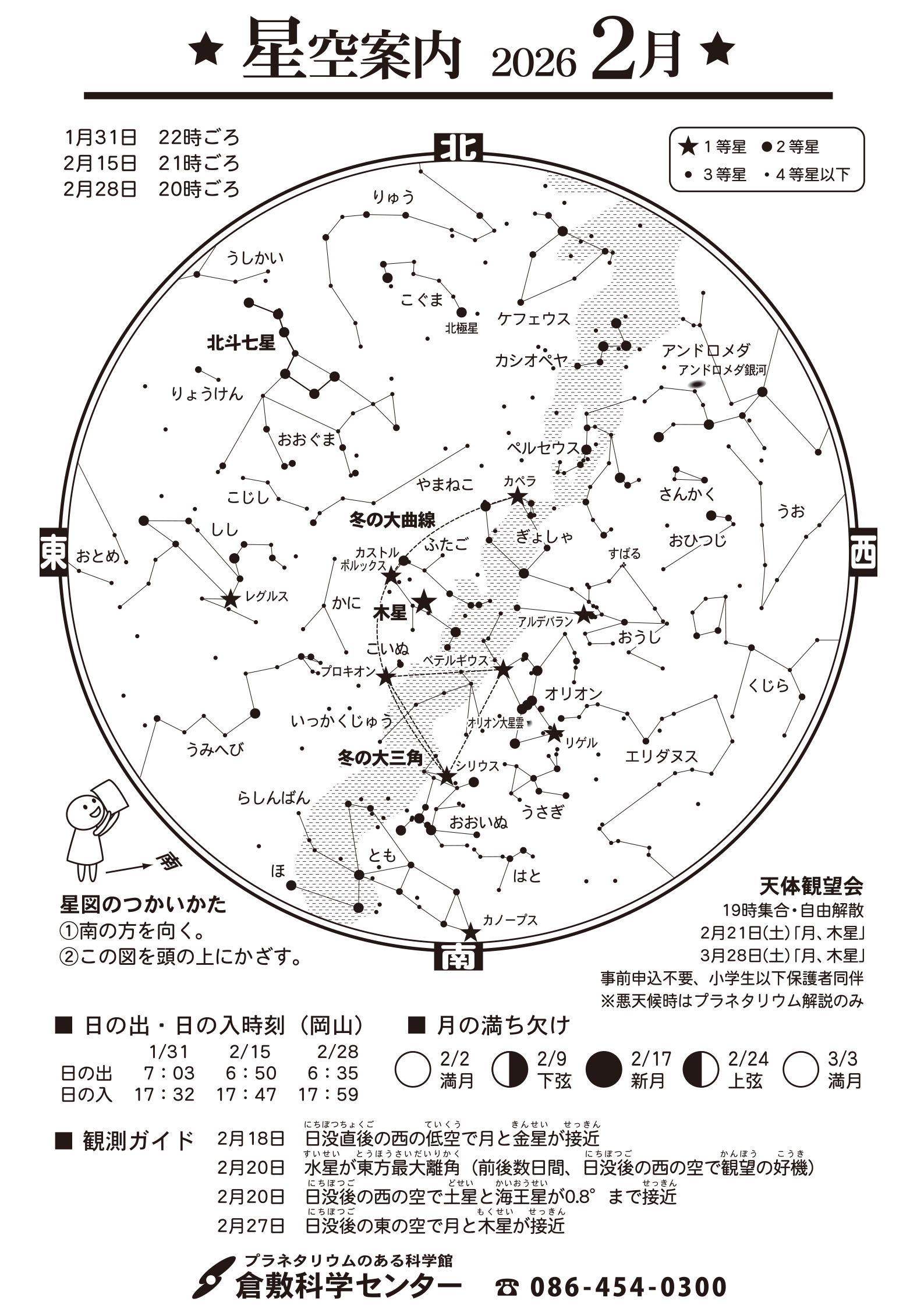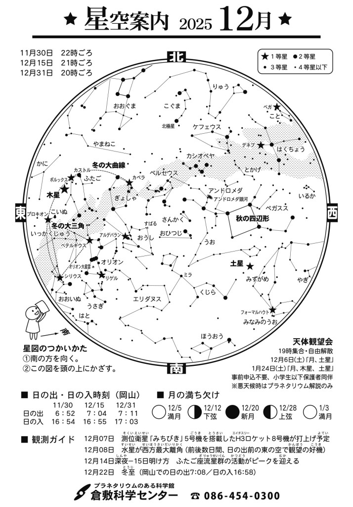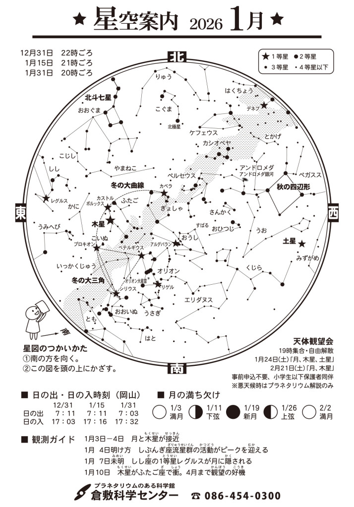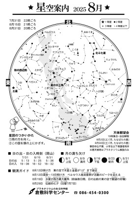 クリックで拡大してご覧ください。 科学センターの受付の周辺に設置しています。また、天体観望会などでも配布しています。 四季折々の星空や月のこよみ、近日中に起こる天文現象など、月ごとの星空の楽しみ方を紹介しています。学校、こども会、個人など、非営利な教育目的であれば、断りなく自由に印刷し配布を行えます。